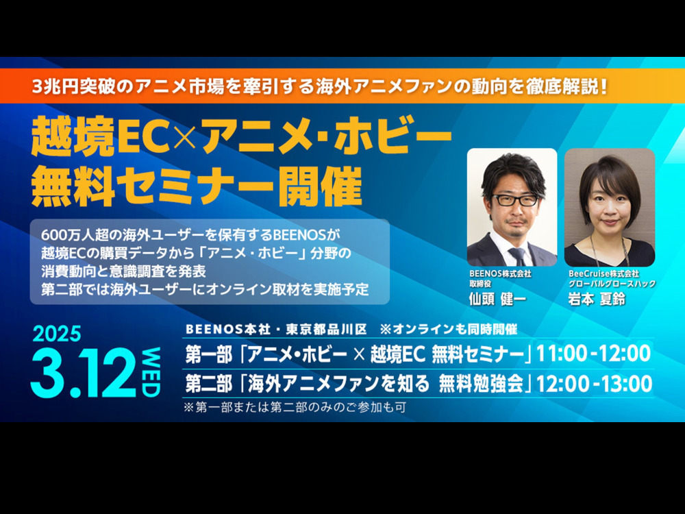 BEENOS株式会社(東証プライム 3328、本社:東京都品川区、代表取締役:直井 聖太、以下BEENOS)は、「BEENOS 越境EC×アニメ・ホビー 無料セミナー」を3月12日(水)11時よりBEENOS本社およびオンラインで開催いたします。本セミナーは二部構成です。第一部では海外ユーザー数600万人を超えるBEENOSグループの保有する購買データより「海外で人気のアニメ作品ランキング」や「商品分野別の人気アニメ作品」、「次に海外ヒットが予測されるアニメ作品」など、様々な視点から海外アニメファンを分析して解説いたします。第二部では海外アニメファンのライブインタビューを通して、購買データからは見えないn=1のインサイトに迫ります。